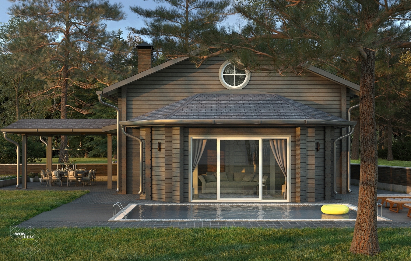 Это отдельно стоящее строение, в котором гармонично совмещены банные и жилые зоны. Как правило, такая баня включает: