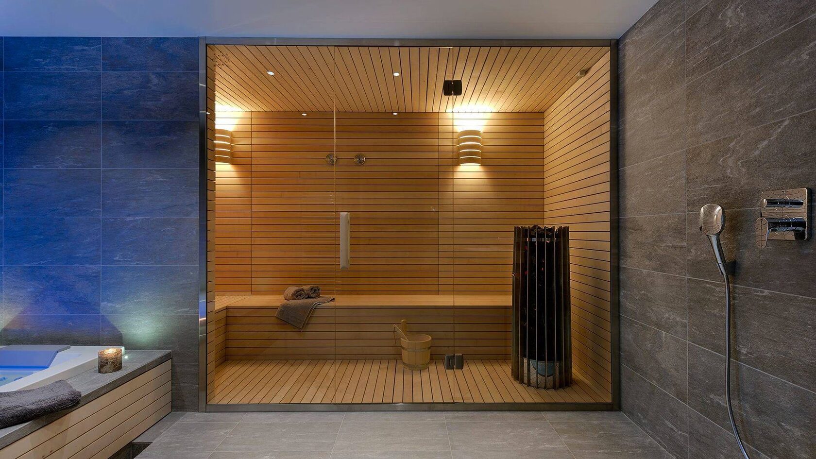 Внутренняя отделка выполняется деревом, устойчивым к высокой влажности и температуре — липой, осиной, абашем. Полы чаще делают плиточными с трапом для слива воды. Устанавливается печь — дровяная или электрическая, монтируется дымоход и бак для горячей воды.