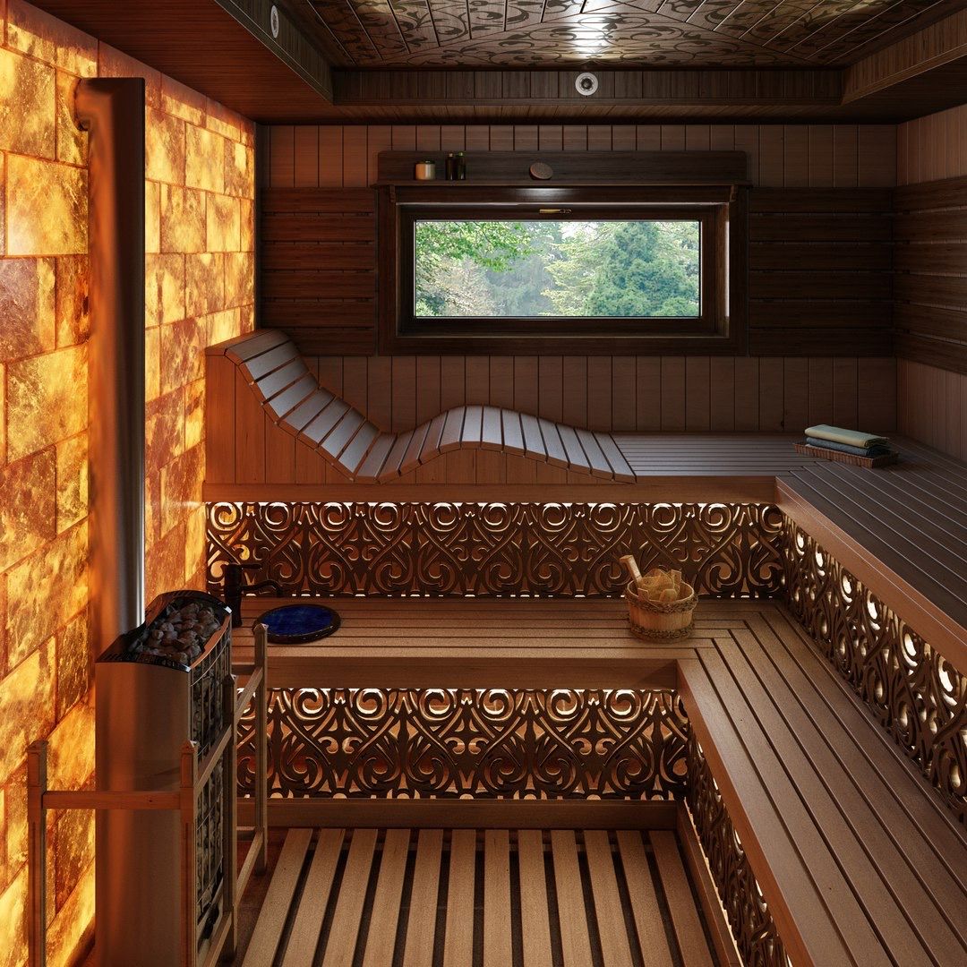 Подпорные стенки и фундаменты можно оформить камнем, декоративной штукатуркой или зеленью, чтобы гармонично вписать баню в природу.