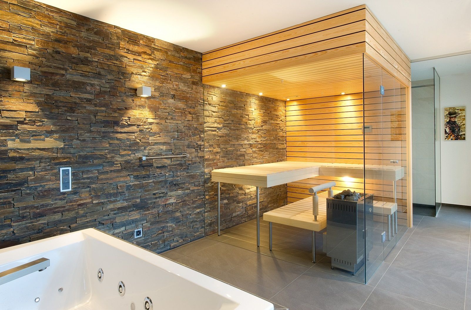 Камень может использоваться как в интерьере, так и в экстерьере — от пола в моечной до акцентной стены в комнате отдыха.